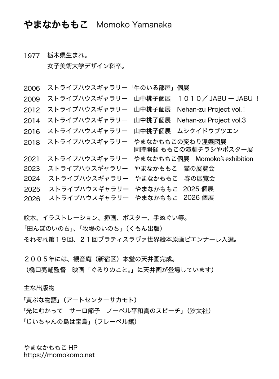 Momoko Yamanaka やまなかももこ 2026 個展 2026年3月5日(木)〜16日(月) AM11:00-PM6:30 最終日はPM5:30まで 会場は3Fギャラリー やまなかももこのHPはこちら→●