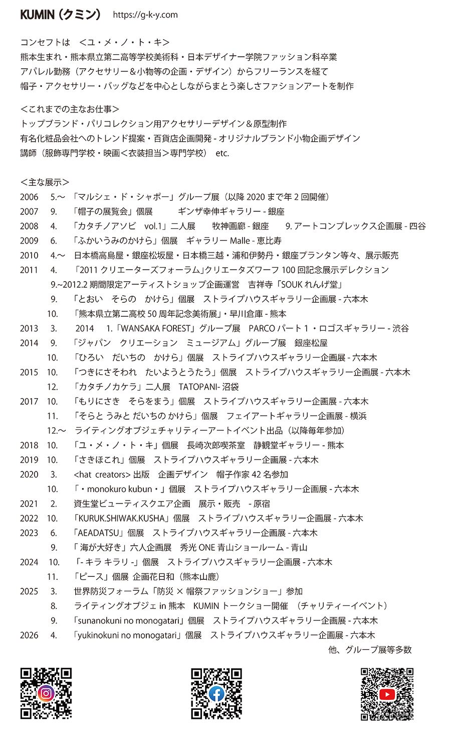 KUMIN fashion art yukinokuni no monogatari 4月13日(月)〜22日(水) AM11:00-PM6:30 最終日はPM5:30まで 会場は3Fギャラリー KUMINのHPはこちら→●