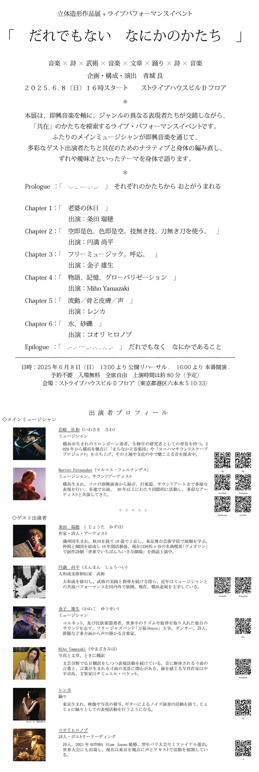 Makoto Aoki 青城良 個展 「だれでもない、なにかのかたち」 2025年6月3日(火)〜10日(火) 会場はDフロア パフォーマンス 6月8日(日)PM4:00開演