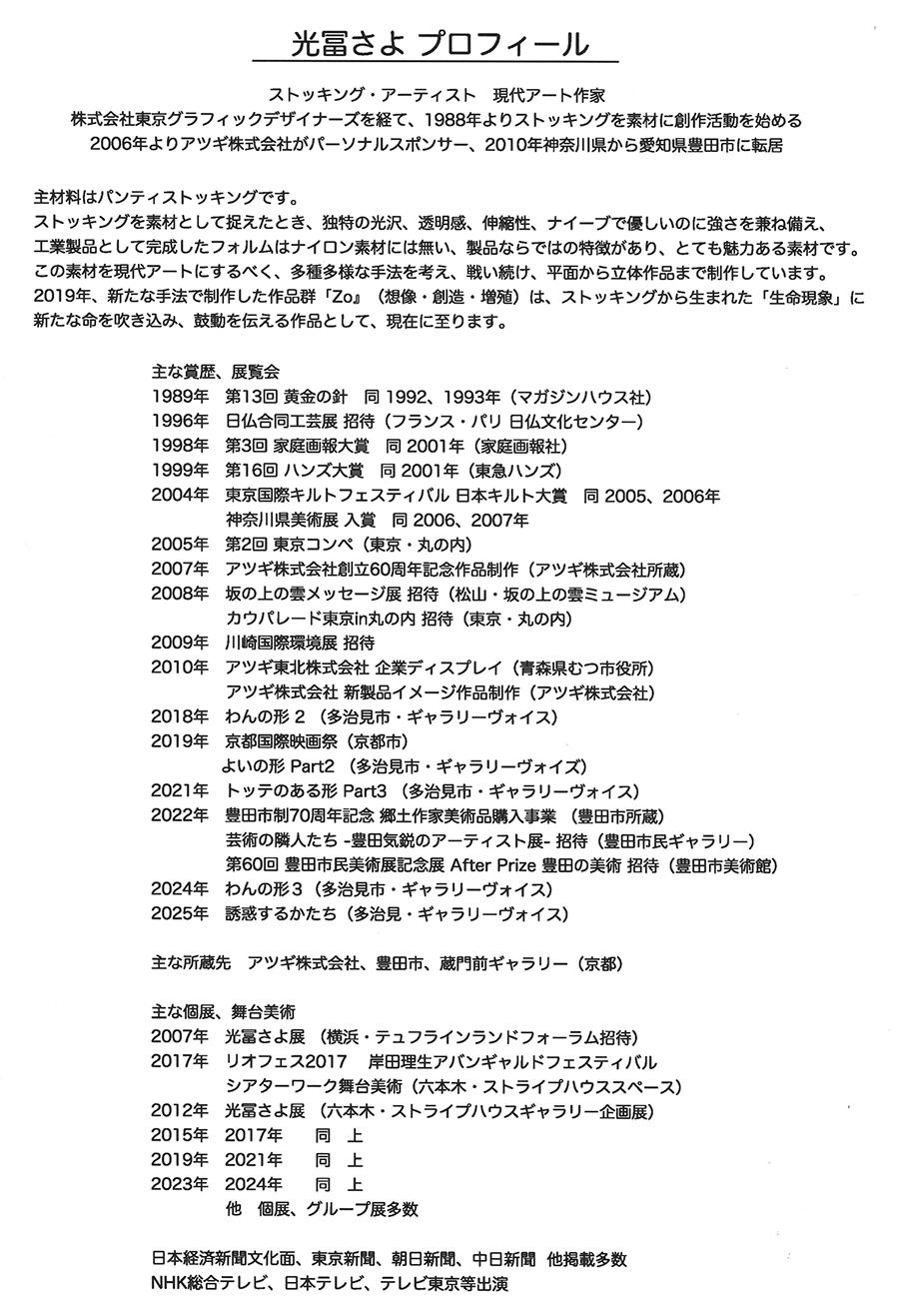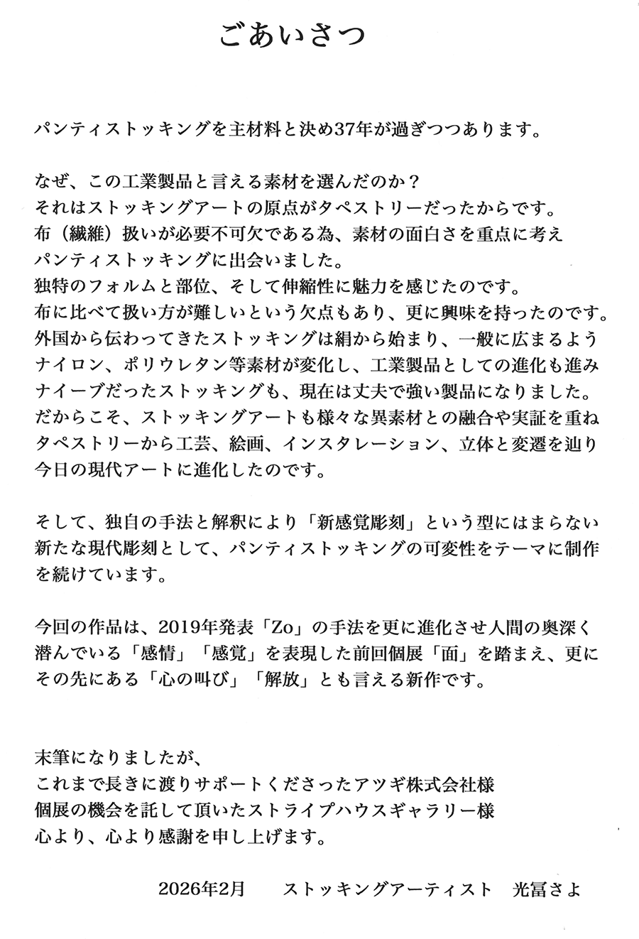 Sayo Mitsutomi 光冨さよ ストッキングアート展 吐 2026年2月14日(土)〜22日(日) AM11:00-PM6:30 最終日はPM5:30まで 会場は3Fギャラリー 光冨さよのHPはこちら→●